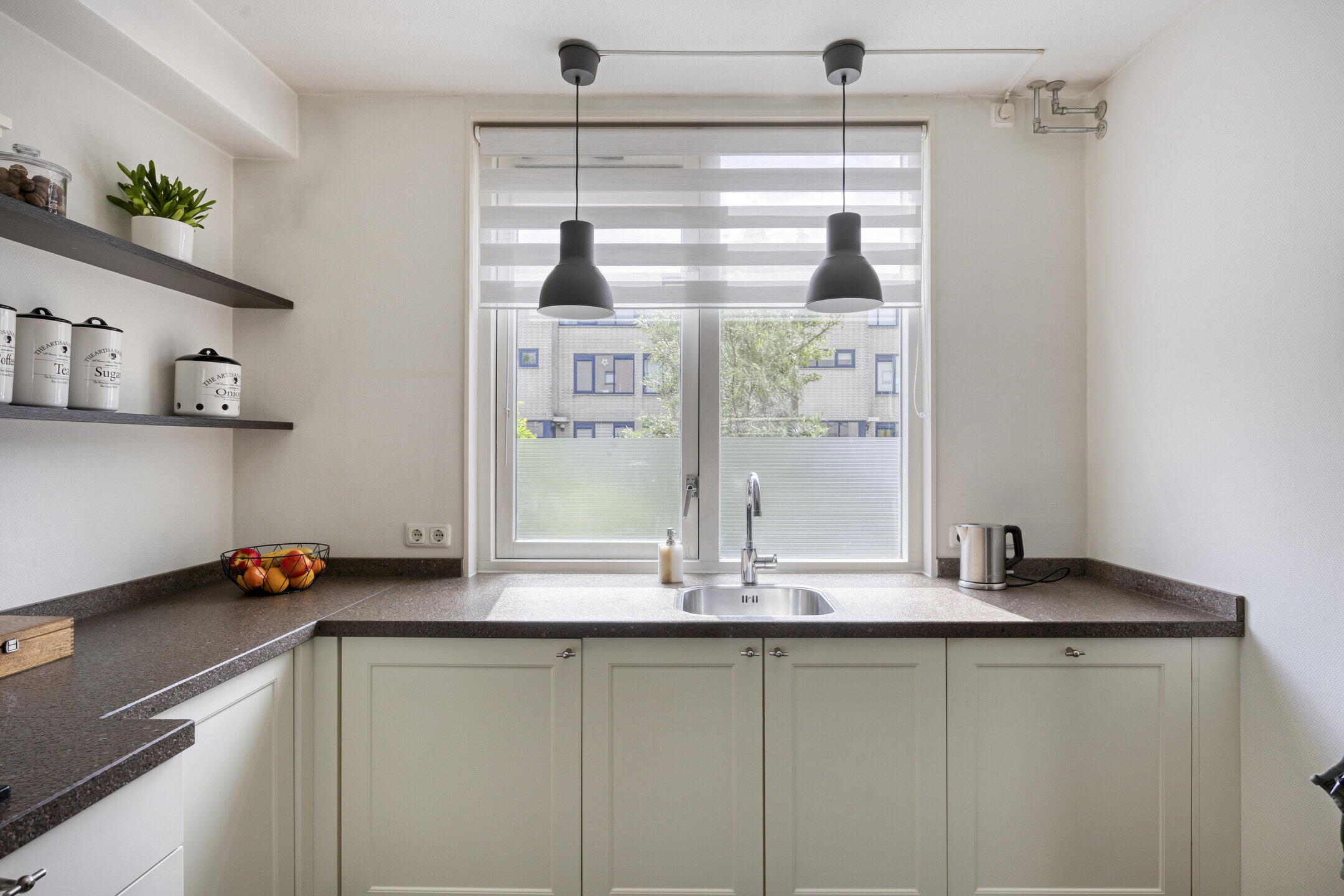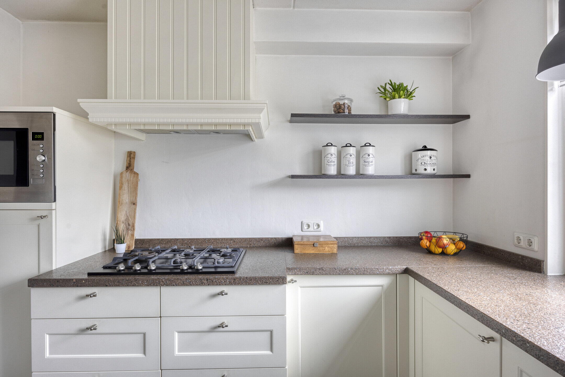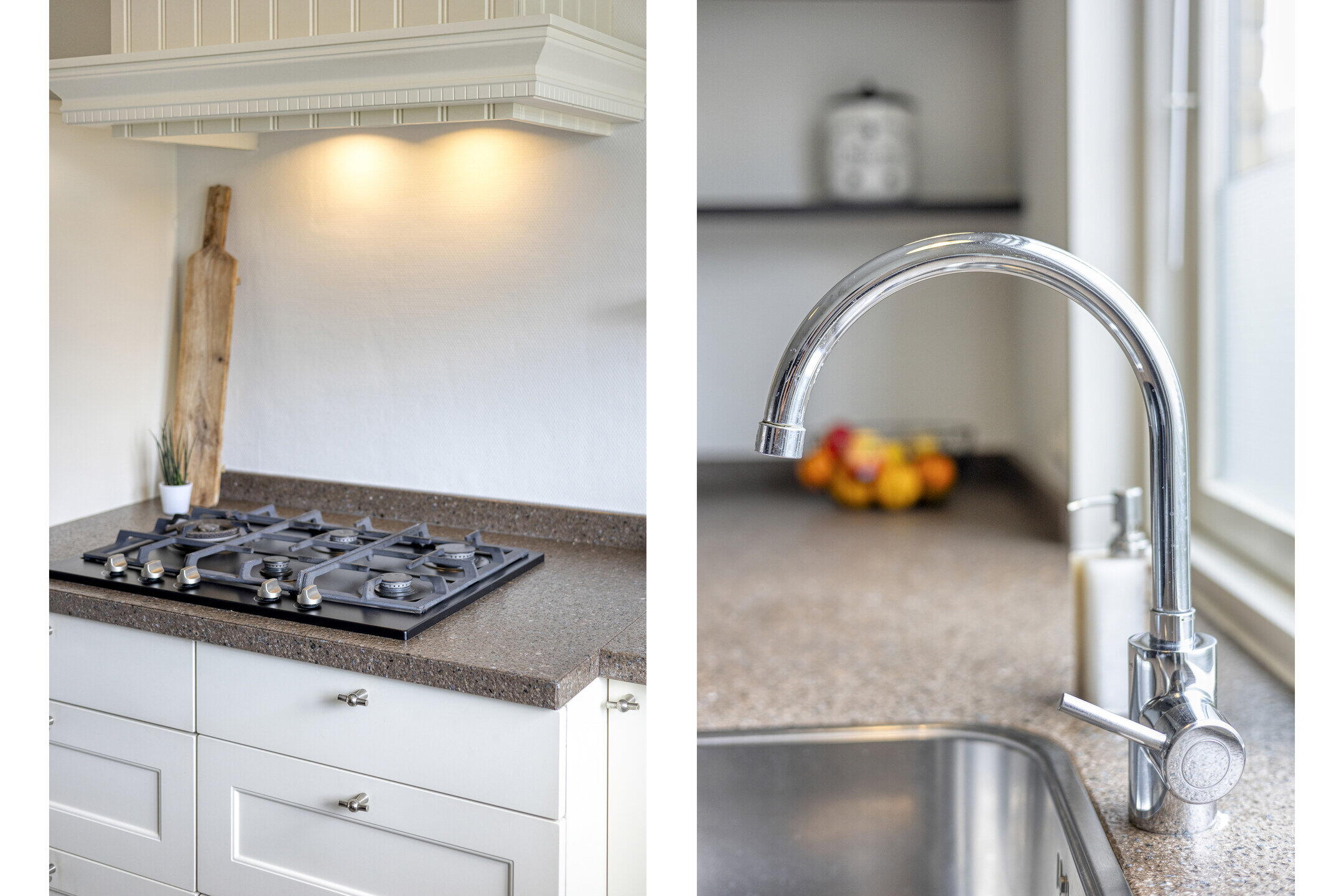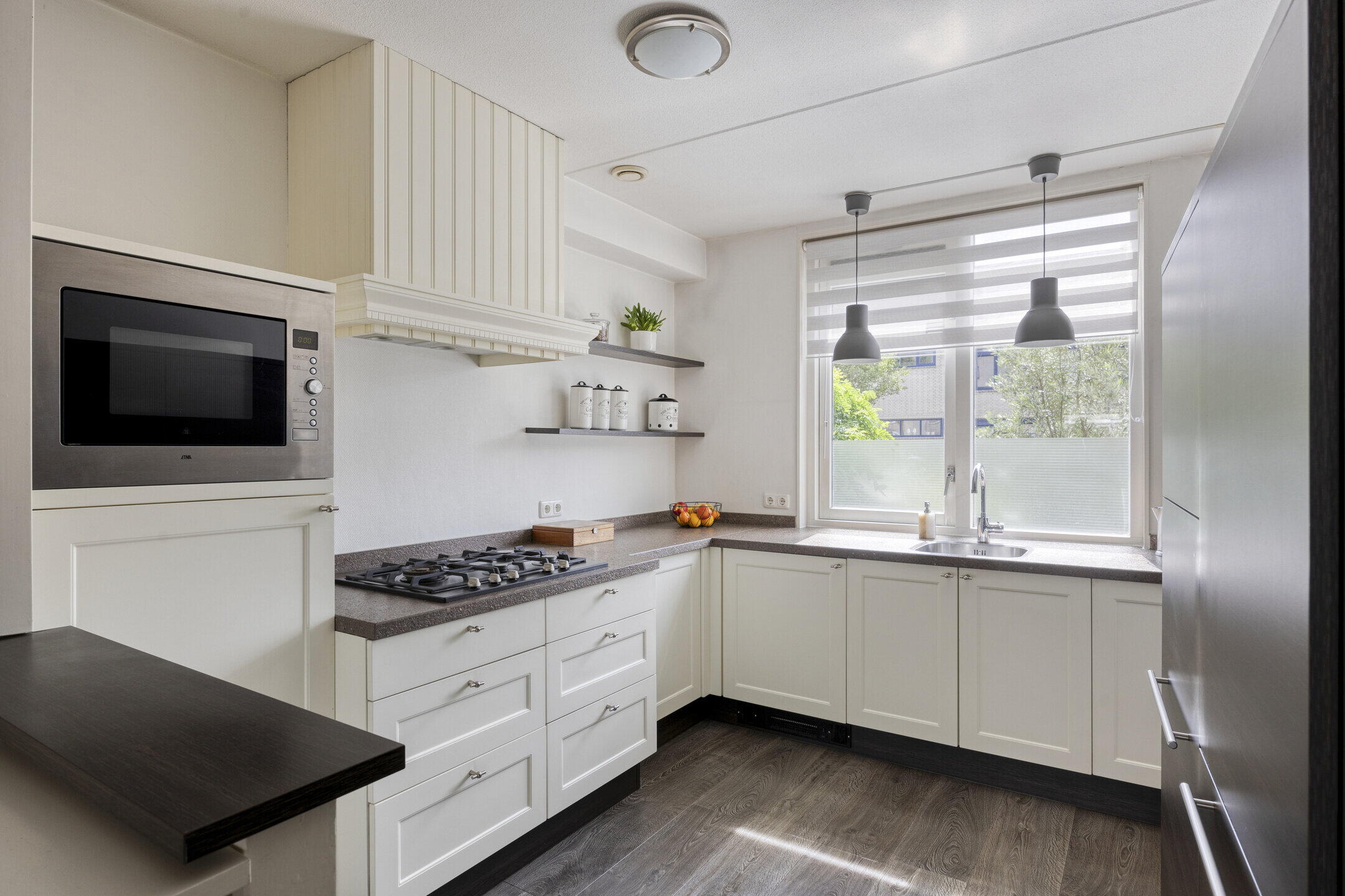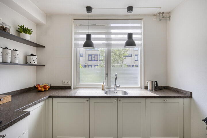 Aan de voorzijde van de woning bevindt zich de open keuken in frisse, tijdloze stijl met witte kastfronten en een bruin gemêleerd werkblad. De keuken is volledig uitgerust met een 5-pits gasfornuis, afzuigkap, koelkast, combimagnetron en vaatwasser. Ideaal voor wie graag kookt of gasten ontvangt.