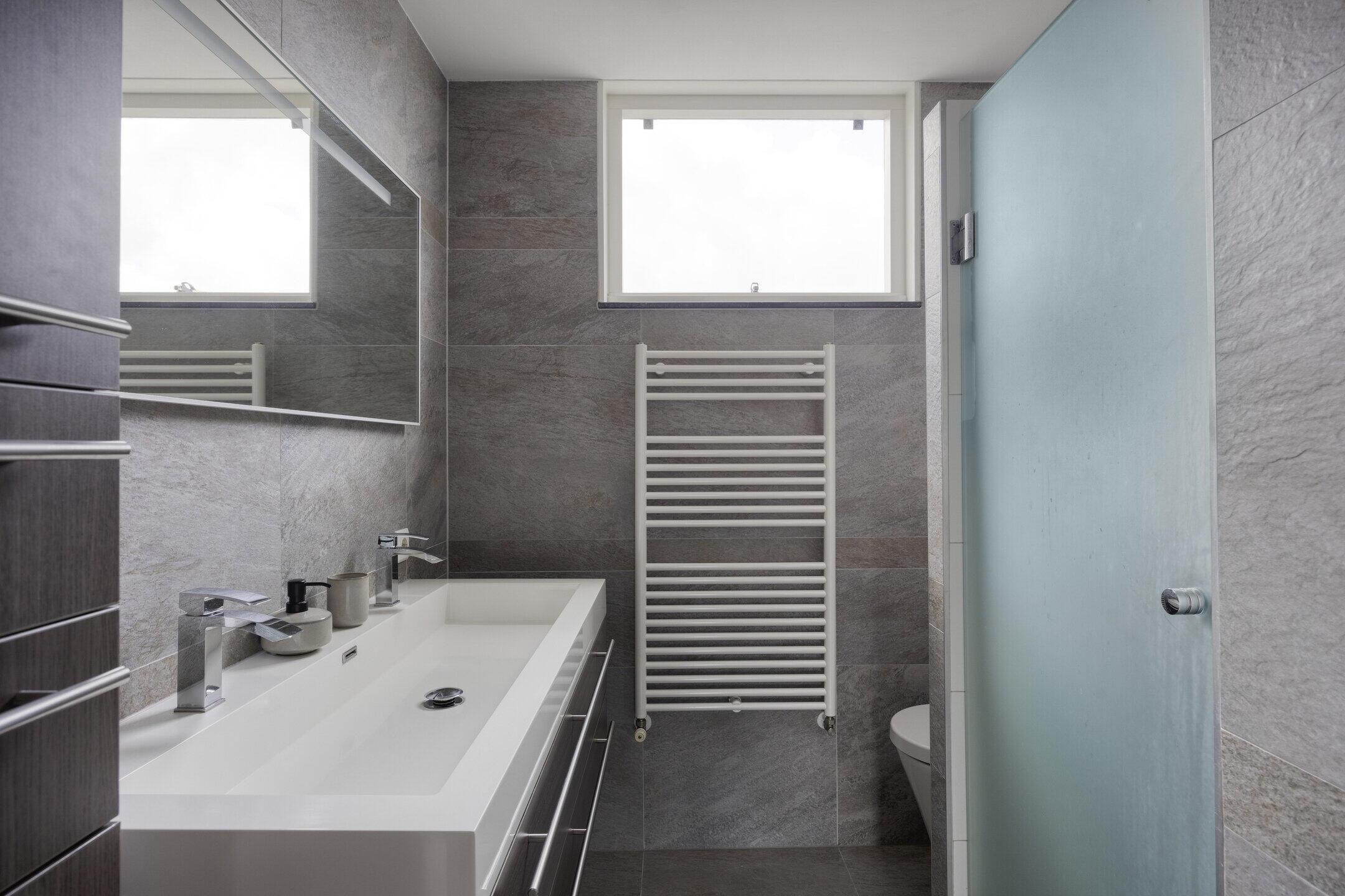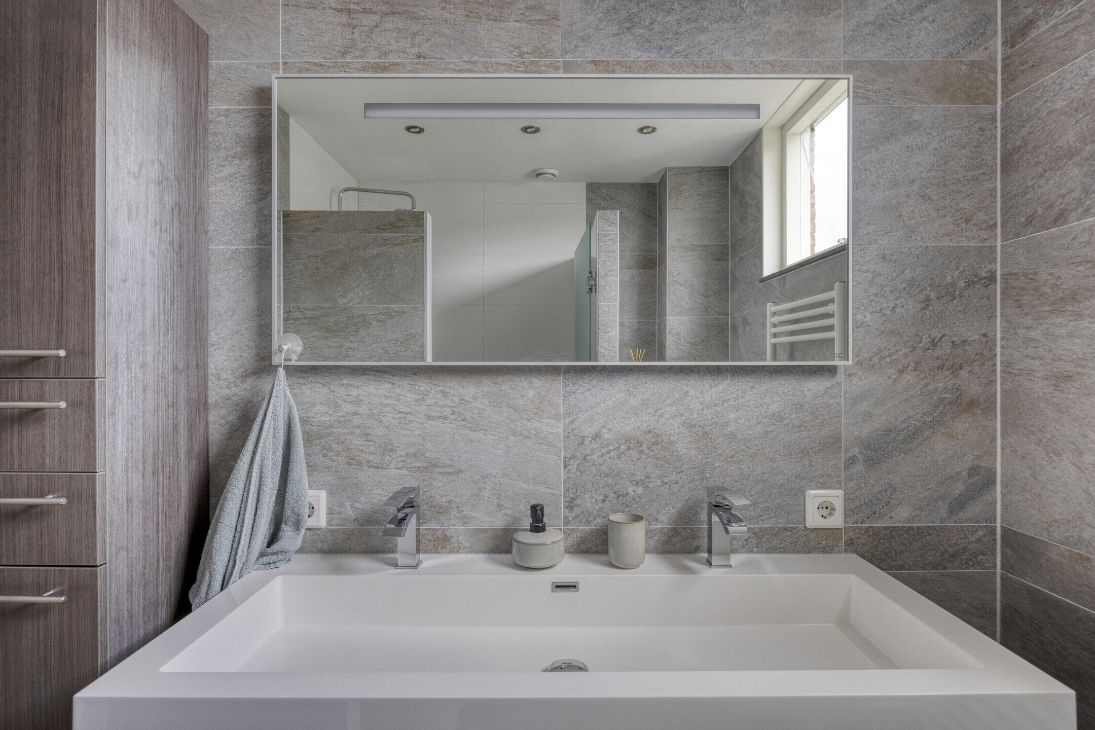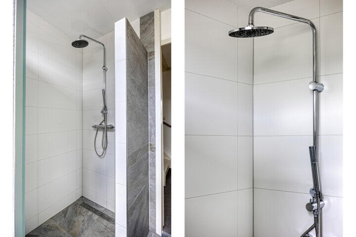 Op de eerste verdieping bevinden zich drie goed bemeten slaapkamers en een moderne badkamer. De badkamer is stijlvol afgewerkt met grote grijskleurige wand- en vloertegels en beschikt over een inloopdouche met glazen deur, een tweede toilet, een breed wastafelmeubel met dubbele kraan én een raam voor natuurlijk licht en ventilatie.