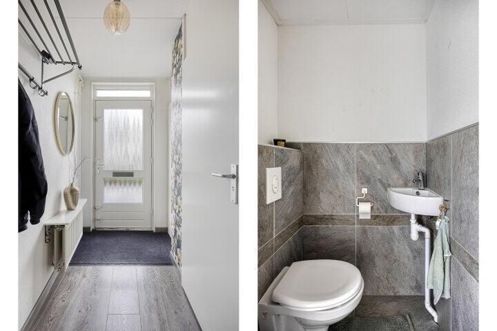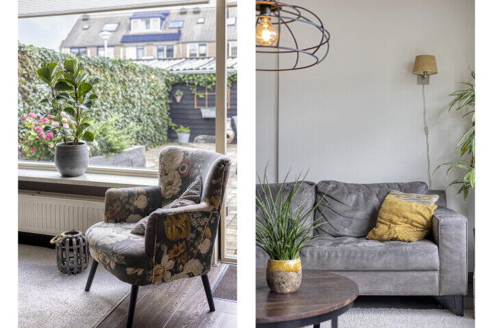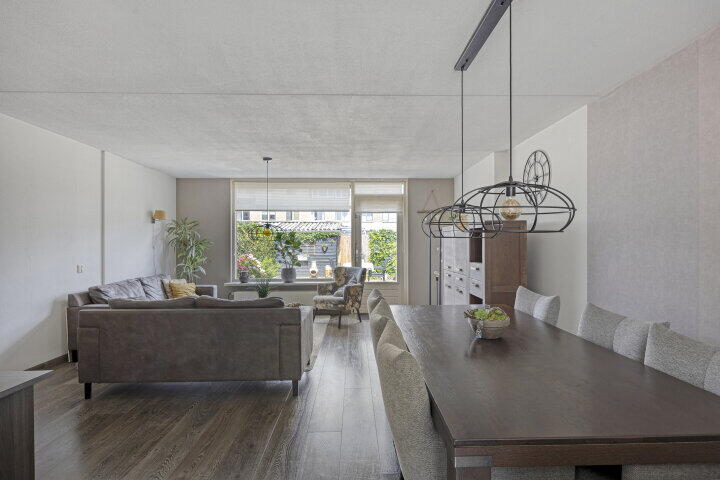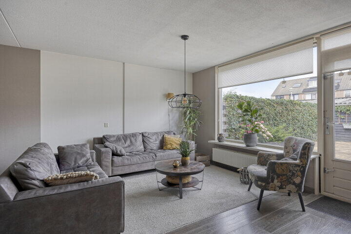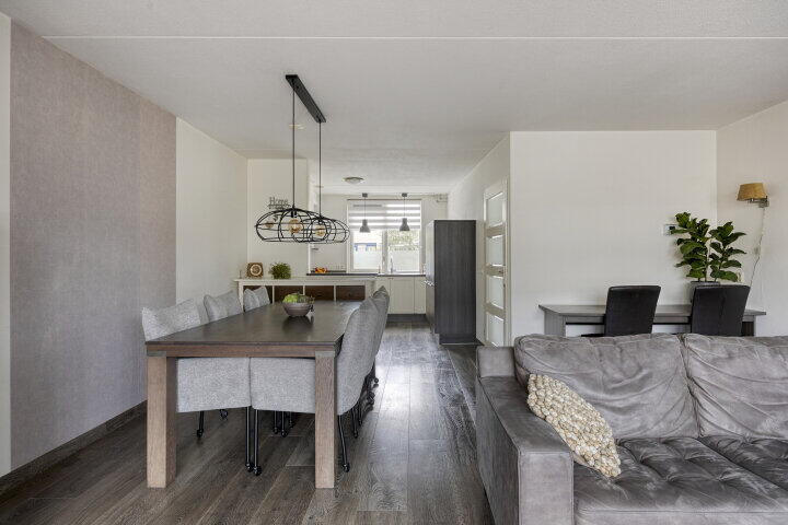 Via de hal met toilet, garderobe, trapkast, meterkast en trapopgang kom je in de royale en lichte woonkamer. Hier geniet je van een fijne doorzonruimte met uitzicht op de fraai aangelegde achtertuin. Er is voldoende plaats voor een ruime zithoek én een aparte eethoek, perfect voor gezellige etentjes.